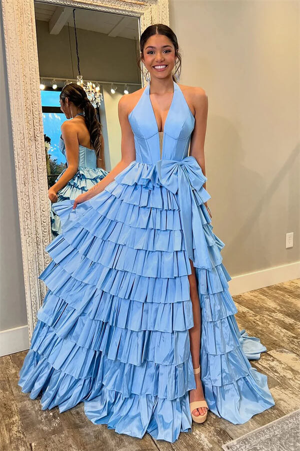 - Cute Blue Satin A Line V Neck Side Slit Long Prom Dress With Bow, SLP104