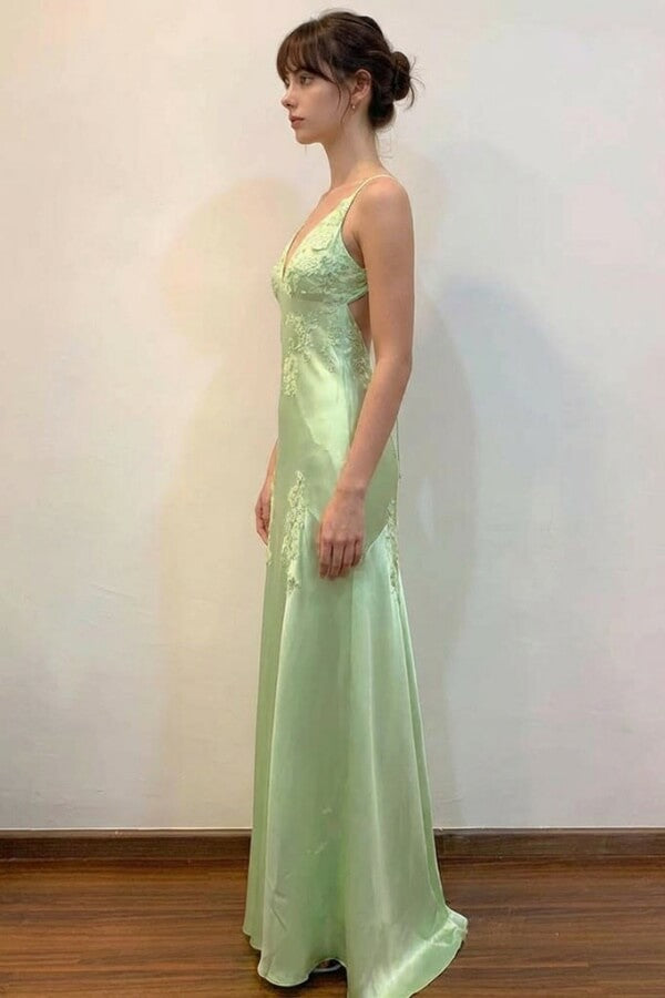 - Green Satin Sheath V Neck Lace Appliques Open Back Prom Dresses, SLP094