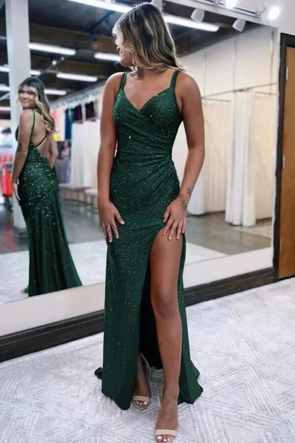 - Sparkly Red Mermaid V Neck Spaghetti Straps Long Prom Dresses With Slit, SLP113